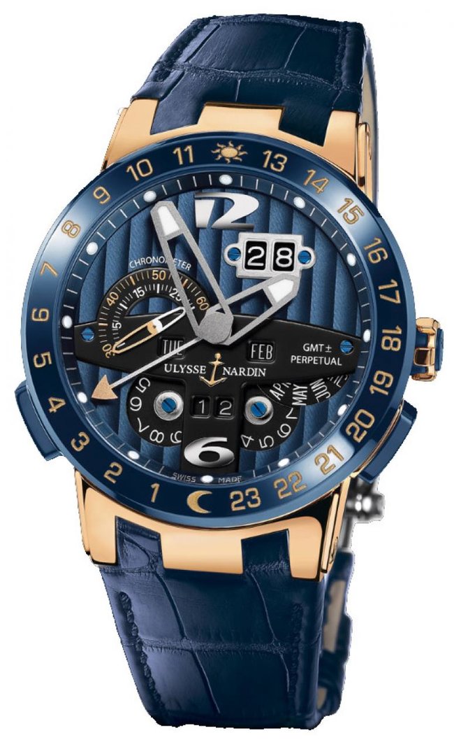 Blue Toro – новый дерзкий вызов от Ulysse Nardin, сочетание традиции часового дела с будущим, объединение высоких технологий и классического дизайна. Новое творение безупречно как в техническом отношении, так и в эстетическом. Опираясь на богатое наследие, «Улисс Нардан» соединил материалы корпуса модели Moonstruck с механизмом легендарного вечного календаря. Blue Toro – революционный прорыв часового искусства, причина тому – сложность механизма и несравнимое удобство применения. Безель и кнопки выполнены из керамики. Скелетолизированные стрелки позволяют прекрасно видеть календарь, большой указатель даты, дня недели, месяца, года и 24- часовой индикатор местного времени. За биением сердца этого механического шедевра можно наблюдать сквозь сапфировое стекло задней крышки корпуса. Лимитированная 99 экземплярами серия Blue Toro Limited Edition доступна эксклюзивно в монобрендовых бутиках компании UlysseNardin. • Механизм вечного календаря, позволяет корректировать вперед или назад все календарные указатели: дату, месяц, год. Настройка осуществляется поворотом заводной головки в одну или другую сторону даже на 2100 год. • Часовая стрелка в считанные секунды устанавливается на новое местное время нажатием на кнопки (+) или (-), которые расположены в положении «4 часа» и «8 часов». Одно нажатие соответствует одному часу. При этом не нужно снимать часы с руки и останавливать их ход. • Большой указатель даты, дня, месяца и года мгновенно передвигаются вслед за часовой стрелкой, как вперёд, так и назад. • 24-часовая стрелка показывает домашнее или местное время. • Ротор из 22-каратного золота обеспечивает автоматический подзавод и запас хода в 45 часов.