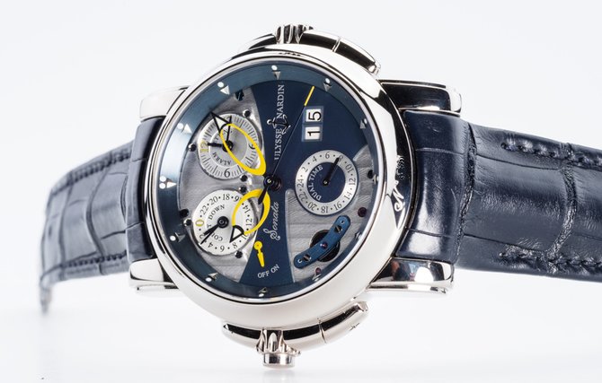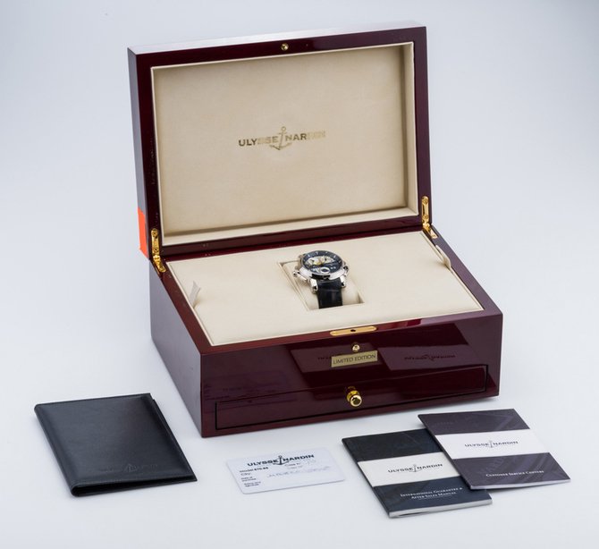 В часах Ulysse Nardin установлен совершенный швейцарский механизм, имеющий официальный сертификат COSC. Более 165 лет компания производит механические часы высочайшего класса. Морские хронометры Ulysse Nardin до сих пор высоко ценятся коллекционерами со всего мира. Ulysse Nardin остается в рядах новаторов часовой индустрии, первыми внедряя новые материалы для производства деталей механизма и изобретая самые необычные механические шедевры. Мануфактура Ulysse Nardin развеивает стереотип о корабельном якоре как о приспособлении, тормозящем движение судна. Сделав его своим символом, компания уверенно двигалась к вершинам, пока не стала одной из самых уважаемых и влиятельных не только в Швейцарии, но и во всем мире. Впервые часы под маркой Ulysse Nardin были созданы в 1846-м году. Судьба у них была непростая, но чрезвычайно романтичная. Из родного Ле-Локля эти часы отправились бороздить моря. Необычное название бренда — не что иное, как имя его создателя. Швейцарский мастер Улисс Нардан принадлежит к династии часовщиков, что на его родине, надо сказать, не редкость. Профессии он обучался не только у собственного отца, которого звали Леонарда-Фредерика Нардана, но и двух именитых наставников, очень уважаемых в те времена — Луи-Жан-Ришара ди Бресселя и Фредерика-Вийома Дюбуа. Последний-то как раз и слыл специалистом по части изготовления астрономических часов и приборов для навигации. С легкой руки Дюбуа молодой мастер Улисс Нардан и заинтересовался морскими хронометрами. В данной модели - увеличенная дата, система звучания `Cathedral Gong` для будильника, двойное время, запас хода - 42 часа.