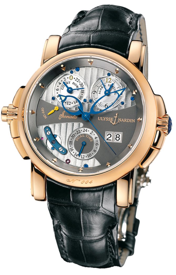 Более 165 лет компания производит механические часы высочайшего класса. Морские хронометры Ulysse Nardin до сих пор высоко ценятся коллекционерами со всего мира. Ulysse Nardin остается в рядах новаторов часовой индустрии, первыми внедряя новые материалы для производства деталей механизма и изобретая самые необычные механические шедевры. Мануфактура Ulysse Nardin развеивает стереотип о корабельном якоре как о приспособлении, тормозящем движение судна. Сделав его своим символом, компания уверенно двигалась к вершинам, пока не стала одной из самых уважаемых и влиятельных не только в Швейцарии, но и во всем мире. Впервые часы под маркой Ulysse Nardin были созданы в 1846-м году. Судьба у них была непростая, но чрезвычайно романтичная. Из родного Ле-Локля эти часы отправились бороздить моря. Необычное название бренда — не что иное, как имя его создателя. Швейцарский мастер Улисс Нардан принадлежит к династии часовщиков, что на его родине, надо сказать, не редкость. Профессии он обучался не только у собственного отца, которого звали Леонарда-Фредерика Нардана, но и двух именитых наставников, очень уважаемых в те времена — Луи-Жан-Ришара ди Бресселя и Фредерика-Вийома Дюбуа. Последний-то как раз и слыл специалистом по части изготовления астрономических часов и приборов для навигации. С легкой руки Дюбуа молодой мастер Улисс Нардан и заинтересовался морскими хронометрами. В данной модели - увеличенная дата, система звучания `Cathedral Gong` для будильника, двойное время, запас хода - 42 часа.