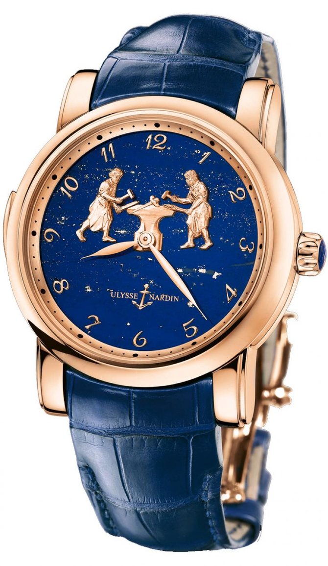 Лимитированная модель 50 экземпляров Forgerons Minute Repeater от компании Ulysse Nardin. Механизм - с ручным заводом, калибр UN-71, с запасом хода 40 часов. Корпус выполнен из розового золота, 18к, диаметр 42 мм. Циферблат синего цвета. Ремешок из кожи аллигатора синего цвета с откидной застежкой из 18К розового золота. Водонепроницаемость 30 м.