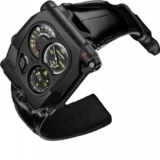 Выполняет такие функции, как: часы, минуты, секунды, запас хода, индикатор суточной погрешности хода. Калибр UR-EMC с ручным заводом и электронной системой контроля точности, частотой колебаний баланса 28,800 пк/час. Urwerk EMC BLACK водонепроницаемы на глубине до 30 м и обладают запасом хода в 80 часов. Браслет из кожи аллигатора с титановой вставкой.