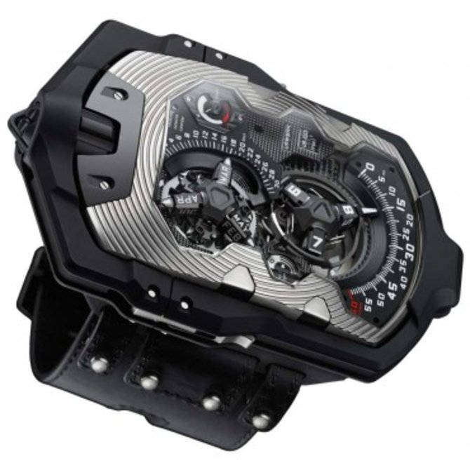 Многофункциональные механические часы от Urwerk - швейцарского часового бренда люкс-класса; одного из самых дорогих, престижных и традиционных часовых брендов в мире. Корпус: сложной формы; матово-полированный; выполнен из титана. Основные параметры корпуса: 106 x 62 миллиметра - диаметр; 23 миллиметра - толщина; 30 метров - водонепроницаемость. Механизм: мануфактурный; автоматический подзавод; производство - Urwerk, Швейцария. Особенности механизма: ретроградные минуты, дата, месяц, индикатор дня и ночи, запас хода, индикатор замены масла. Год производства - 2015. Ремешок: натуральная кожа аллигатора; раскладная застежка из титана; ручная работа. Циферблат: черно-серый; защитное стекло - сапфировое; люминесцентное покрытие на индикаторах.