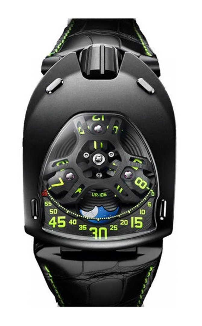Модель UR-106 "Only Watch" от компании Urwerk представлена в корпусе сложной формы из титана с черным покрытием PVD. Часы выпущены специально для благотворительного аукциона "Only Watch". Астрономические часы указывают на циферблате данные часов, минут, а также фазы Луны. Габариты корпуса: 35.00 x 49.40 х 14.45 мм. Циферблат накрыт сапфировым стеклом. Заводная головка размещена вверху корпуса. Внутри часов установлен автоматический мануфактурный механизм производства Urwerk, Швейцария. Ремешок черного цвета из крокодильей кожи дополнен классической пряжкой из титана. Водонепроницаемость - 30 метров. Год выпуска часов - 2015.