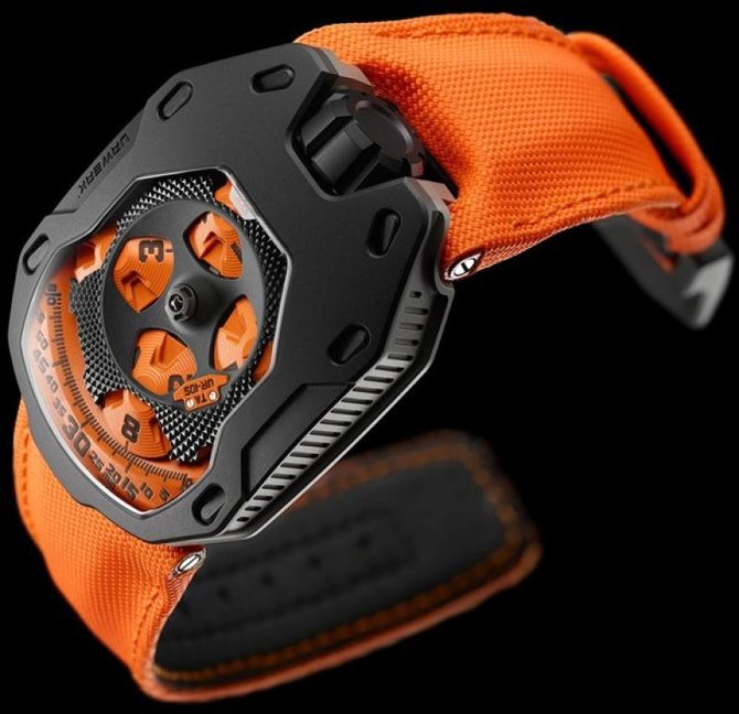 Неординарная часовая компания Urwerk презентовала очередную новинку бренда под именем UR-105 TA (Turbine Automatic), еще часто именуемую «Urwerk Knight». Девиз модели: "Часы, украшающие время". Модель обладает сателинным индикатором с четырьмя дисками. Такой указатель долгие годы является символом компании. Также модель имеет балдахин, выполненный из высокотехнологичного термопластика, который придает оригинальности отображению времени. Эта модель - результат долгих исследований и разработок бренда в области отображения времени с, так называемым, блуждающим часом. Часовой механизм данных часов обсуждается часовыми знатоками как один из самых хитроустроенных в мире. Его особенность - невидимая карусель, расположенная под дисками. Она гарантирует тихую смену часов. По центру задней стороны модели расположены турбины с черным покрытием PVD. Благодаря специальному рычагу предоставляется возможность сменить режим подзавода. К примеру, в положении Full действует автоматический подзавод, а в положении Stop включается обычный ручной подзавод, осуществляемый с помощью часовой заводной головки. Существует еще одно положение подзавода, отмеченное как RED (Reduced), которое соответствует облегченному режиму, дающему возможность избежать лишней натяжки заводной пружины.