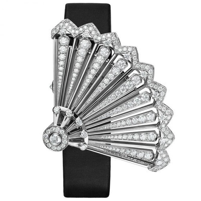 Женские механические швейцарские часы от легендарной швейцарской часовой мануфактуры Vacheron Constantin представлены в корпусе сложной формы, напоминающей аристократический веер, из белого 18-каратного золота с инкрустацией 315 белыми бриллиантами. Атласный ремешок наделен раскладывающейся застежкой из белого золота. Циферблат часов защищен сапфировым стеклом. Водонепроницаемость корпуса - 30 метров. Модель функционирует на швейцарском мануфактурном механизме с ручным подзаводом, Калибр 1055. Толщина Калибра - 2.10 миллиметров; диаметр - 15.7 миллиметров. Он состоит из 115 элементов, 21 из которых - драгоценные камни. Частота механизма - 3 Гц (21 600 полуколебаний в час). Запас хода - 40 часов. На циферблате указывается текущее время в часах и минутах.
