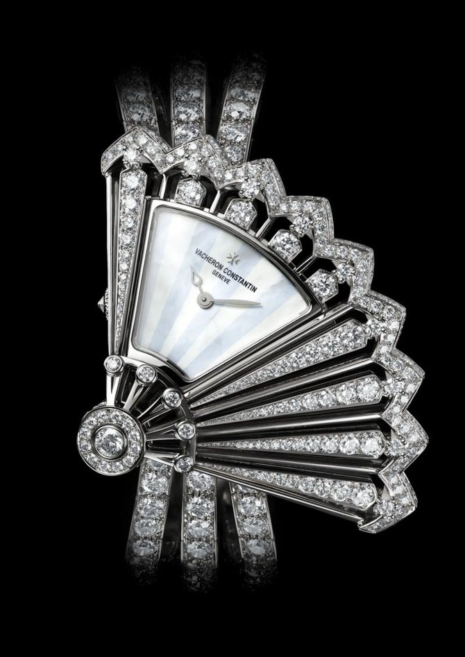 Женские механические швейцарские часы от легендарной швейцарской часовой мануфактуры Vacheron Constantin представлены в корпусе сложной формы, напоминающей аристократический веер, из белого 18-каратного золота с инкрустацией 438 белыми бриллиантами. Браслет также из белого золота, полностью инкрустированный белыми бриллиантами и наделен раскладывающейся застежкой. Циферблат часов защищен сапфировым стеклом. Водонепроницаемость корпуса - 30 метров. Модель функционирует на швейцарском мануфактурном механизме с ручным подзаводом, Калибр 1055. Толщина Калибра - 2.10 миллиметров; диаметр - 15.7 миллиметров. Он состоит из 115 элементов, 21 из которых - драгоценные камни. Частота механизма - 3 Гц (21 600 полуколебаний в час). Запас хода - 40 часов. На циферблате указывается текущее время в часах и минутах.