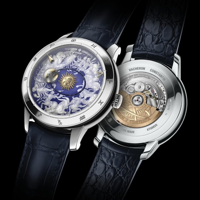 Астрономические швейцарские часы Vacheron Constantin Metiers d`Arts Copernicus Celestial Spheres 2460 RT 7600U/000G-B226 - результат совмещения искусства с часовым мастерством. Модель отмечена Женевским клеймом. Автоматический Калибр 2460 RT гарантирует индикацию часов и минут. Основная особенность - эллиптическая траектория движения Земли вокруг Солнца. Механизм обладает сверхточными способностями. Интересно, что он не нуждается в настройке на протяжении 8 тысяч лет. Задняя крышка из сапфирового стекла открывает вид на работу механизма, в частности, на его золотой ротор автоподзавода. Уровень запаса хода - 36 часов. Корпус модели из белого золота. Диаметр - 43 мм, толщина - 12.9 мм. Часы выпущены в единственном экземпляре на весь мир. Цена, рекомендуемая производителем - Vacheron Constantin - 85 000 Евро.