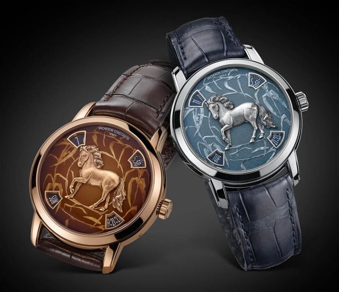 Швейцарская часовая компания VACHERON CONSTANTIN выпустила (в составе коллекции Métiers d’Art и линейки Legend of the Chinese Zodiac) свою новую, отмеченную Женевским клеймом ("Hallmark of Geneva"), лимитированную модель Year of the Horse ("Год Лошади"), которая выпущена в двух вариантах: в платине 950 и в 18-каратном розовом золоте. Год Лошади по китайскому календарю начнется 1 февраля 2014 года. Новинка имеет круглый полированный корпус диаметром 40 мм, толщиной 12,74 мм, водонепроницаемый до 30 метров. На торце заводной головки, расположенной на 3 часах, имеется эмблема бренда VACHERON CONSTANTIN - мальтийский крест. Сапфировое стекло установлено на передней стороне корпуса и на его задней крышке. Циферблат из 18-каратного розового золота, покрытый эмалью "Grand Feu" голубого или бронзового цвета, с объемным изображением вручную выгравированной платиновой или золотой лошади в его центре. Обращает на себя внимание отсутствие стрелок на циферблате. Модель оснащена мануфактурным автоматическим механизмом Vacheron Constantin 2460 G4, состоящим из 237 деталей, диаметром 31,00 мм, толщиной 6,05 мм, на 27 камнях, с балансовой частотой 28800 полуколебаний в час (4 гц), запасом хода 40 часов, функциями индикации часов (посредством соответствующего цифрового указателя в апертуре, расположенной между 10 и 11 часами), минут (посредством соответствующего цифрового указателя в апертуре, расположенной между 1 и 2 часами), даты (посредством соответствующего цифрового указателя в апертуре, расположенной между 4 и 5 часами) и дня недели (посредством соответствующего буквенного указателя в апертуре, расположенной между 7 и 8 часами). Калибр отменно отделан и декорирован. Поставляется на синем или на коричневом ремешке из кожи миссисипского аллигатора с застежкой из платины 950 или из 18-каратного розового золота. Лимитированный выпуск по 12 экземпляров каждого из вариантов модели.