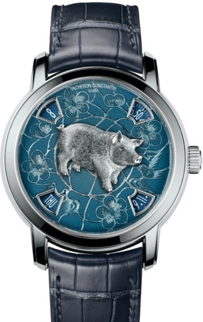 Компания из Швейцарии Vacheron Constantin представила художественную модель наручных часов Metiers d`Arts Legend of the Chinese Zodiac 86073/000P-B429 в корпусе из платины, диаметром 40 х 12.74 мм. Часы пополнили коллекцию Metiers d`Arts. На эмалевом циферблате с выполненной вручную из платины фигуркой свиньи показываются данные часов и минут, даты и дней недели. Ремень из кожи аллигатора синего цвета оснащен пряжкой из платины классического типа. Циферблат защищен стеклом из сапфирового кристалла. Корпус имеет 30-метровую влагостойкость. За функциональность часов отвечает автоматический механизм мануфактурной разработки компании Vacheron Constantin - 2460 G4/2. Часы выпущены в 2019 году ограниченной серией в 12 экземпляров.