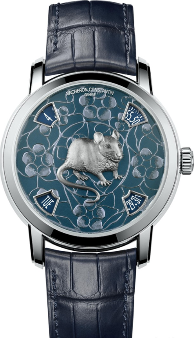 Швейцарские часы Legend of the Chinese Zodiac выпущены в 2019 году, выполнены в круглом корпусе из платины 950 пробы. Циферблат накрыт выпуклым, крепким сапфировым стеклом с антибликовым покрытием. Размер модели составляет 40 х 12,74 мм, водонепроницаемость до 30 метров. Сердцем аксессуара является автоматический механизм с автоподзаводом, Калибр 2460 G4/2, который обеспечивает запас хода до 40 часов беспрерывной роботы. Циферблат синего цвета с эмалью Grand Feu и с гравированной вручную моделью крысы из платины 950 пробы, отображает дату, день недели, часы, минуты. Швейцарские часы Legend of the Chinese Zodiac поставляются с ремешком из кожи аллигатора и вставкой из платины 950 пробы. Серия ограниченна - 12 шт.