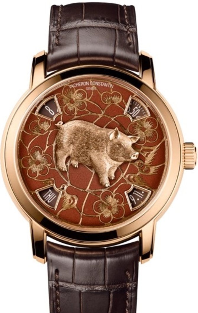 Бренд из Швейцарии Vacheron Constantin представил художественную модель наручных часов Metiers d`Arts Legend of the Chinese Zodiac 86073/000R-B428 в корпусе из розового золота, диаметром 40 х 12.74 мм. Часы пополнили коллекцию Metiers d`Arts. На эмалевом циферблате с выполненной вручную фигуркой свиньи из розового золота показываются данные часов и минут, даты и дней недели. Ремень из кожи аллигатора коричневого цвета оснащен пряжкой из розового золота классического типа. Циферблат защищен стеклом из сапфирового кристалла. Корпус имеет 30-метровую влагостойкость. За функциональность часов отвечает автоматический механизм мануфактурной разработки компании Vacheron Constantin - 2460 G4/2. Часы выпущены в 2019 году ограниченной серией в 12 экземпляров.