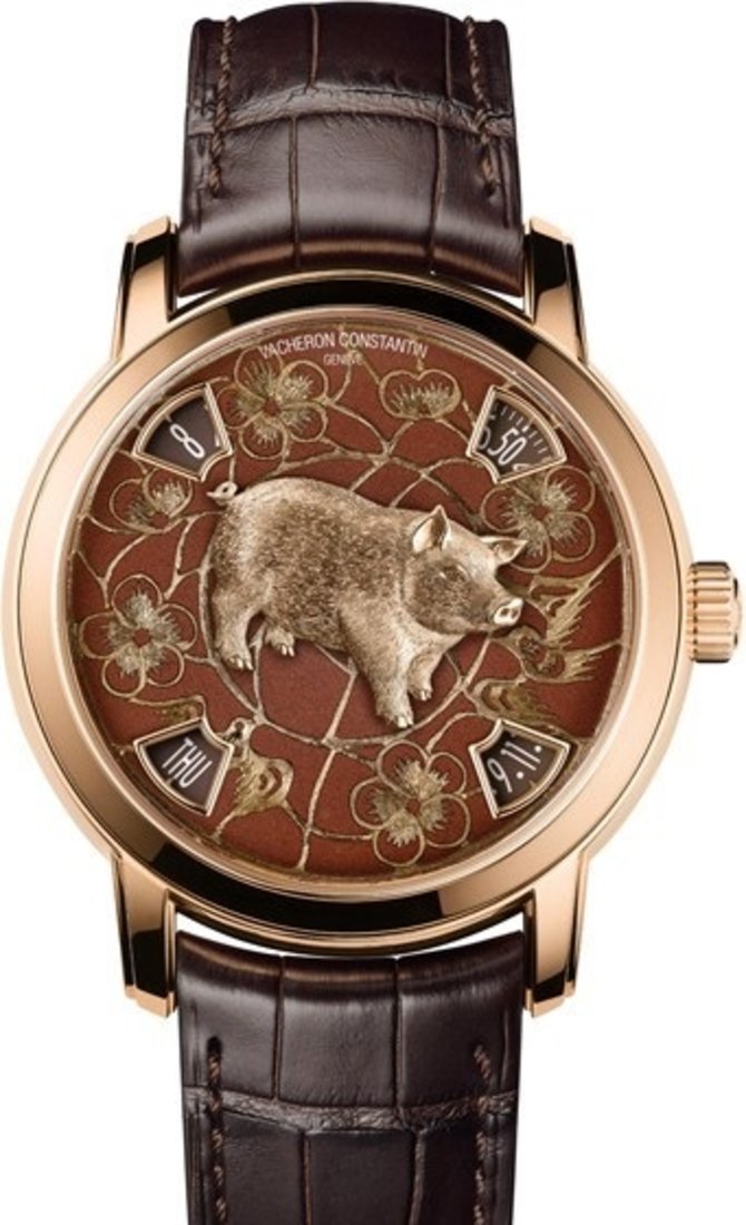 Компания Vacheron Constantin представила модель швейцарских часов Metiers d`Arts Legend of the Chinese Zodiac 86073/000R-B429 специальной серией, ограниченной в 12 экземпляров на весь мир. Серия посвящена 2019 году - Году Свиньи по китайскому календарю. Круглый корпус выполнен из розового 18-каратного золота. Ремешок из кожи крокодила дополнен пряжкой из розового золота. Габариты корпуса: 40 х 12.74 мм. В часах установлен калибр 2460 G4 с автоподзаводом и возможностью индикации часов, минут, даты, а также дней недели. Циферблат украшен золотой фигурой свиньи. Механизм обладает 40-часовым запасом хода. Циферблат защищает прочное сапфировое стекло, устойчивое к царапинам и покрытое антибликовым покрытием. Корпус отличается 30-метровой водонепроницаемостью.