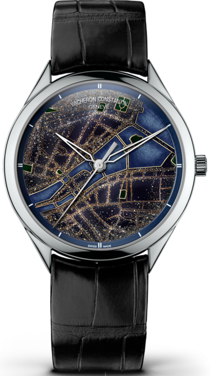 На художественном циферблате модели Metiers d`Arts Villes Lumieres 86222/000G-B101 мастерами компании Vacheron Constantin нанесено изображение ночных панорам крупных городов мира, которые имели и имеют влияние на общую культуру человечества. Автоматический калибр 2460 SC обеспечивает индикацию часов, минут, секунд, а также 40-часовой уровень запаса хода. Толщина корпуса всего 8.9 мм. На циферблате именно этой модели светится панорама города Женевы. Укомплектована модель Metiers d`Arts Villes Lumieres черным крокодиловым ремешком. Застежка классическая, из белого золота. Корпус также произведен из белого золота. Модель представлена ограниченным тиражом - 1 экземпляр. Герметичность корпуса - 30 метров; диаметр - 40 мм.