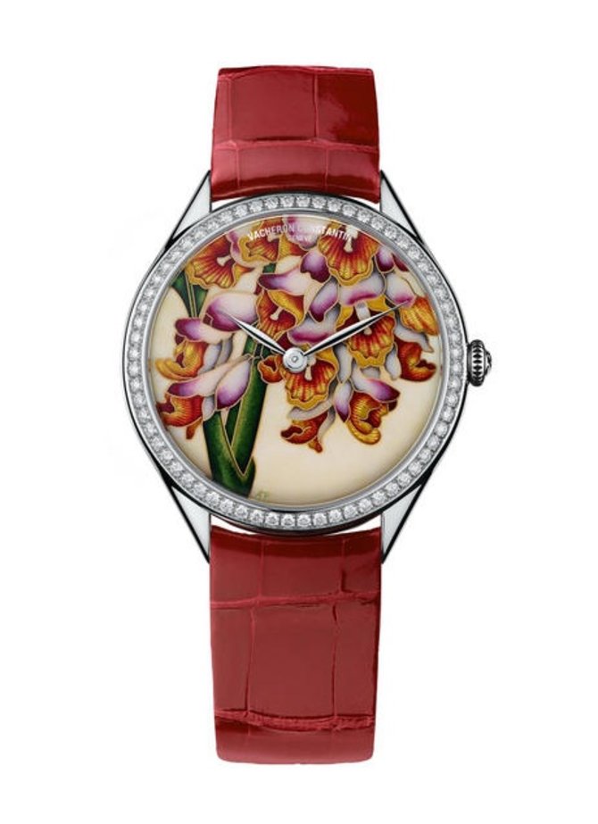 Художественная модель швейцарских часов от марки Vacheron Constantin выпущена в корпусе круглой формы из полированного белого 18-каратного золота, диаметром 37 мм. Безель корпуса декорирован бриллиантами. На шикарном художественном циферблате, защищенном прочным сапфировым стеклом, размещены стрелки для индикации часов и минут. Индикацию данных обеспечивает мануфактурный швейцарский механизм от Vacheron Constantin с ручным подзаводом, отмеченный престижным Женевским Клеймом (пер. Poinçon de Genève). Классическая застежка из белого золота дополняет элегантный ремешок красного цвета, пошитый из натуральной кожи миссисипского аллигатора. Корпус с минимальной водостойкостью в 30 метров (3 атм). Часы пополнили художественную коллекцию бренда Vacheron Constantin - "Metiers D’art".