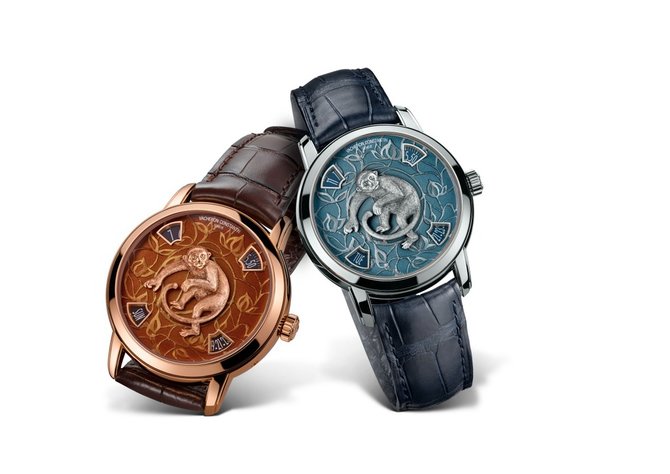 Легендарная часовая мануфактура Vacheron Constantin пополнила свою художественную коллекцию Métiers d’Art двумя совершенно новыми моделями с Женевским клеймом ("Hallmark of Geneva"), выпущенными ограниченным тиражом в платиновом и золотом корпусах по 12 моделей каждая. Как известно, год обезьяны по китайскому календарю начинается с 8 февраля 2016 года. Габариты корпуса: диаметр - 40 миллиметров; толщина - 12.74 миллиметров. Герметичность корпуса - 30 метров. Корпус с двух сторон защищен сапфировым стеклом. Циферблат выполнен из эмали "Grand Feu", а фигурки обезьяны соответствуют материалу корпуса (платиновые либо золотые). Модель обладает швейцарским мануфактурным механизмом с автоподзаводом 2460 G4, который состоит из 237 элементов, 27 из которых - драгоценные камня. Запас хода - 40 часов, балансовая частота - 28800 полуколебаний в час (4 гц). Укомплектованы часы ремешками из кожи крокодила с классическими пряжками, соответствующих корпусу. Модель будет представлена в бутиках Vacheron Constantin.