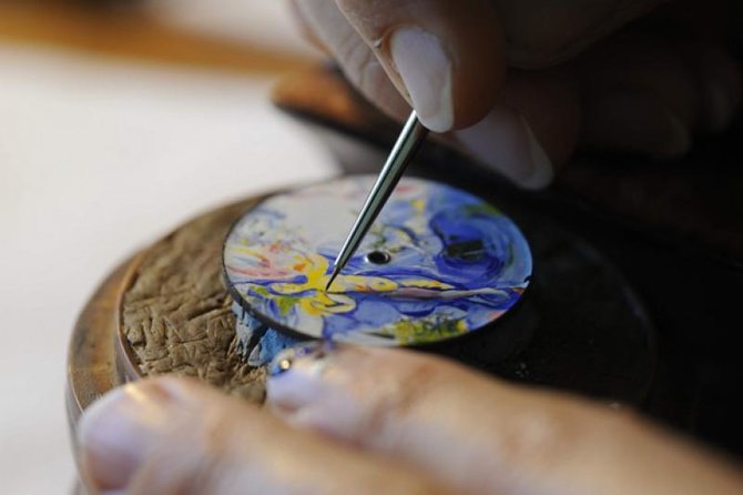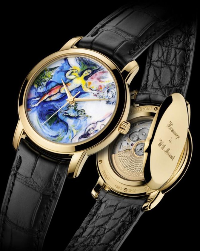 Циферблат: эмаль 'Grand Feu', рисунок, повторяющий роспись Марка Шагала потолка в здании Парижской Оперы Гарнье