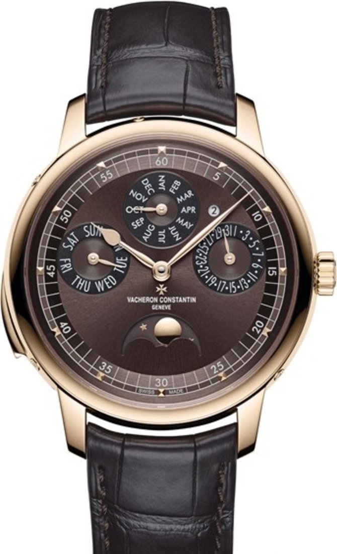 Швейцарские часы с вечным календарем и минутным репетиром от компании Vacheron Constantin, модель Grande Complication Les Cabinotiers Minute Repeater Perpetual Calendar 6610C/000R-B510, выпущены в 2019 году. Калибр 1731 QP с ручным подзаводом имеет запас хода на 65 часов работы. Корпус из розового золота, диаметром 42 мм и толщиной 10.44 мм, комплектуется коричневым ремешком из крокодиловой кожи с фирменной вставкой из золота в виде застежки. На коричневом сатинированном циферблате золотыми стелками показываются часы, минуты, дата, дни недели. Также на циферблате есть индикатор фаз Луны. Лицевая часть золотого корпуса закрыта противобликовым стеклом из сапфира.