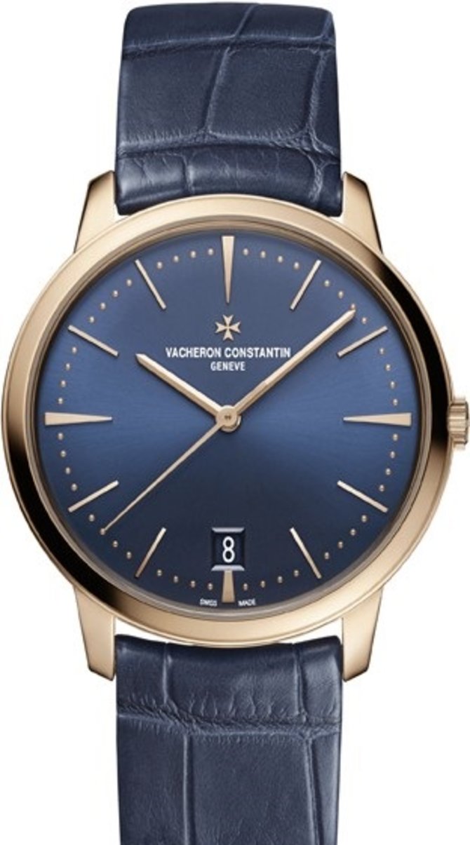 Элегантная модель женских швейцарских часов Vacheron Constantin Patrimony Contemporaine Lady Automatic 4100U/000R-B643 имеет классический циферблат с сатинированной отделкой, где установлены золотые стрелки и часовые метки для индикации текущего времени, а также индикатор даты в районе отметки "6 часов". Сапфировый кристалл защищает циферблат от повреждений. Автоматический калибр 2450 Q6/3 с 40-часовым запасом хода. На руке часы фиксируются ремешком из натуральной крокодиловой кожи синего цвета и застежкой из золота. Водонепроницаемость корпуса из розового золота, размером 36 х 8.1 мм, составляет 30 метров. Модель была представлена в 2020 году.
