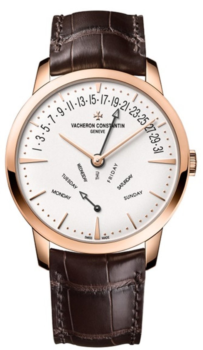 Элегантная мужская модель швейцарских часов от компании Vacheron Constantin вошла в коллекцию Patrimony. Модель Retrograde Day Date Ref. 4000U/000R-B110 оснащена автоматическим механизмом, установленным внутрь полированного корпуса из розового золота. Ретроградными индикаторами на белом циферблате показываются часы, минуты, дата и дни недели. Диаметр золотого корпуса - 42.5 мм, а толщина - 9.7 мм. Максимальный запас хода механизма 2460 R31R7/2 - 40 часов. Комплектуются золотые часы коричневым ремешком из кожи аллигатора с золотой пряжкой классического типа. Стекло из сапфирового кристалла закрывает и циферблат, и выполняет роль задней крышки, сквозь которую виден ротор автоматического подзавода с фирменной гравировкой.