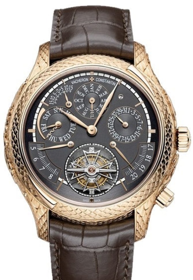 Уникальная новинка от часовой компании Vacheron Constantin, выпущенная в единственном экземпляре (1 шт.), представлена в круглом корпусе из розового золота, на который нанесена фирменная гравировка в виде шкуры змеи. Астрономические часы многофункциональны. На циферблате показываются: часы, минуты, секунды, дата, день недели, месяц, цикл високосного года, запас хода, уравнение времени, время восхода солнца, время захода солнца, карта звездного неба, фаза и возраст луны, звездные часы и минуты, сезоны, знаки зодиака. Механизм с ручным заводом 2755В отличается турбийоном, репетиром и вечным календарем. Циферблат закрыт сапфировым стеклом. Водостойкость корпуса - 30 метров. Механизм имеет 58 часовой запас хода.