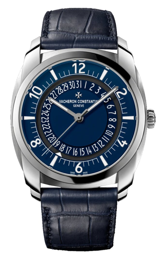 Швейцарские часы Vacheron Constantin Quai de l`Ile Date Self-Winding Steel 4500S/000A-B364. Корпус часов сделан из нержавеющей стали. Механизм, установленный внутри корпуса 41 мм в диаметре, с автоподзаводом, калибр 5100/1. Индикация, осуществляемая на циферблате - часы, минуты, секунды, дата. Часовая и минутная стрелки с люминесцентным покрытием. Ремешок пошит из кожи аллигатора в синем цвете. Циферблат защищает выпуклое сапфировое стекло. Механизм имеет 60-часовой запас хода. Водонепроницаемость корпуса - 30 метров. Производитель укомплектовал часы дополнительным ремешком.