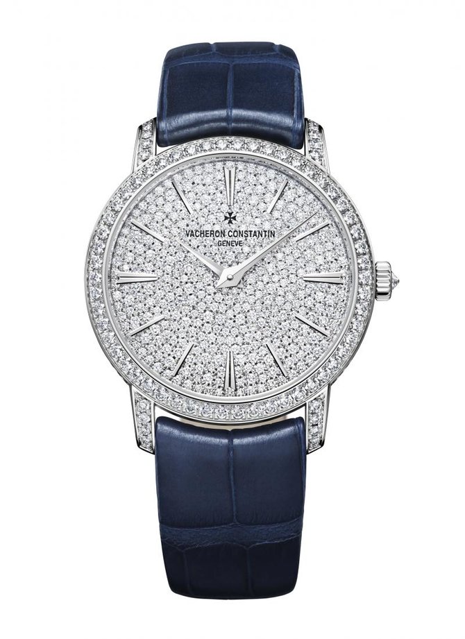 Элегантная модель Traditionnelle Small Model Fully Paved Hand-Wound от престижного часового бренда Vacheron Constantin представляет собой уникальную комбинацию женского изящества и технического прогресса на стильном браслете из кожи крокодила синего цвета. Часы стильно декорированы белыми классическими круглыми бриллиантами. Модель оснащена просвещающейся задней крышкой из сапфирового стекла, через которое видно часовой механизм с ручным заводом, Калибр 1400. Циферблат полностью декорирован белыми бриллиантами. Максимальный запас хода механизма - 40 часов; водонепроницаемость - 30 метров. Корпус часов - из белого 18-каратного золота. Габариты корпуса: 33 х 7.7 мм. Механизм отмечен Женевским клеймом. Бренд Vacheron Constantin по праву считают одним из числа самых дорогостоящих и престижных марок с уникальным, в большей мере, традиционным дизайном. Компания VC больше всего пользовалась популярностью среди аристократии Франции и Италии.