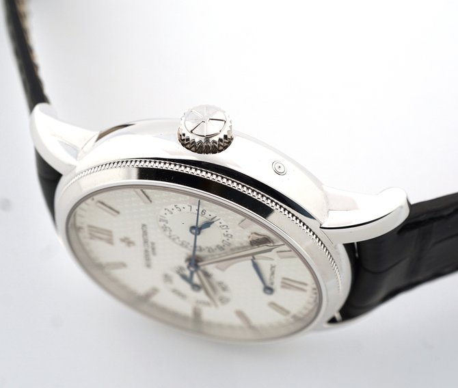 Представленная модель от легендарной часовой марки Vacheron Constantin была выпущена ограниченной серией в 500 экземпляров. Сердце часов - автоматический мануфактурный механизм, калибр 2475, с возможностью индикации данных часов, минут, секунд, даты, дня недели и запаса хода механизма, что составляет 43 часа. Механизм помещен в корпус из белого 18-каратного золота, диаметром 40 мм и 12.1 мм в толщину. Полировка корпуса осуществлена вручную мастером Vacheron Constantin. Защитное стекло изготовлено из сапфирового кристалла. Водонепроницаемость корпуса - до 30 метров. На запястье руки часы фиксируются прочным ремешком коричневого цвета ручной работы, который пошит из натуральной кожи аллигатора. Классическая пряжка произведена из белого золота.