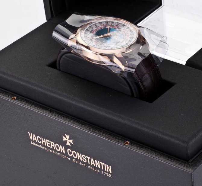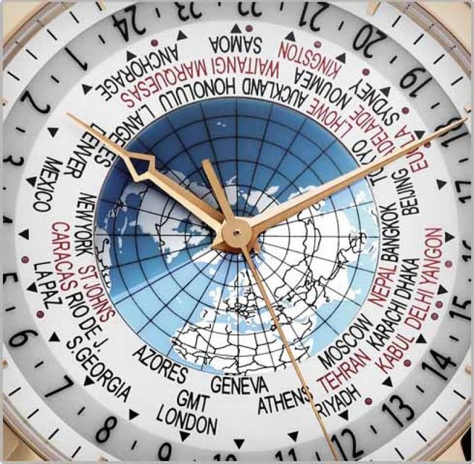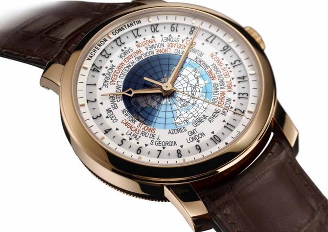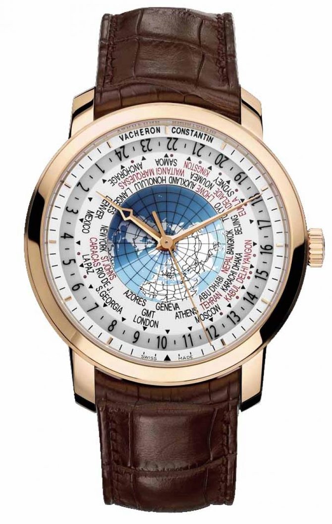 Модель Patrimony Traditionnelle World Time (Ref.: 86060/000R-9640) от VACHERON CONSTANTIN представлена на выставке SIHH-2011, которая проходит в настоящее время в Женеве. Круглый корпус из 18-каратного розового золота, диаметром 42,50 мм, водонепроницаемый до 30 метров. Сапфировое стекло на лицевой стороне корпуса и на его задней крышке. Циферблат состоит из трех зон (от центра к периферии): - сапфировый диск указателя "день/ночь"; - металлический диск с картой Северного полушария в проекции Ламберта и названиями городов; - металлический диск с минутной шкалой и накладными золотыми часовыми маркерами. В модели Patrimony Traditionnelle World Time представлен новый запатентованный калибр 2460WT с автоматическим механизмом. Он спроектирован и собран Vacheron Constantin, отмечен Женевским клеймом (Hallmark of Geneva), диаметром 36,60 мм (¼ 11''), толщиной 8,10 мм, на 27 камнях, с балансовой частотой 28800 полуколебаний в час (4 гц) и способен указывать время во всех 37 часовых поясах мира, включая те, которые сдвинуты от всемирного координированного времени на полчаса и на пятнадцать минут. Новая модель Patrimony Traditonnelle World Time от Vacheron Constantin возвращает в коллекцию усложнение, которое является неотъемлемой частью исторического наследия знаменитой женевской часовой мануфактуры.