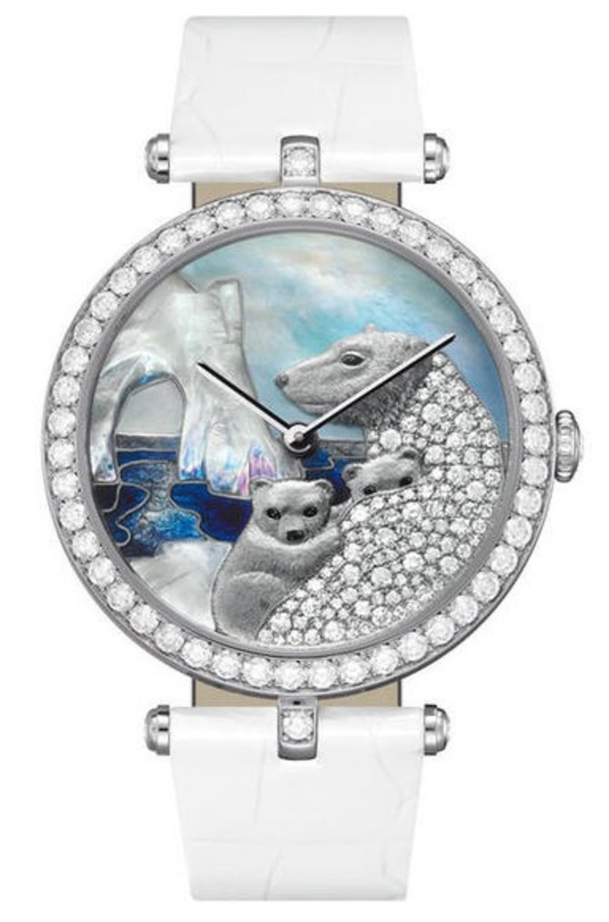 Яркая ювелирная модель швейцарских наручных часов для женщин продемонстрировала умение часовой компании Van Cleef & Arpels комбинировать высокое часовое искусство с ювелирным делом. Представленная Вашему вниманию модель "Polar Lanscape" помещена в коллекцию "Extraordinary Dials". Корпус часов выполнен из высококачественного 18-каратного белого золота. При его украшении применялись белые бриллианты классической огранки. Роскошный циферблат, декорированный полярным мотивом и бриллиантами, служит для индикации часов и минут стрелками из белого золота. Индикацию обеспечивает швейцарский механический мануфактурный механизм с ручным подзаводом. Сапфировое стекло защищает удивительный часовой циферблат от повреждений. Ремешок, пошитый мастерами компании вручную из кожи луизианского аллигатора, дополняет классическая пряжка из белого золота. Модель выпущена в 2011 году. Тираж пронумерованный, неограниченный.