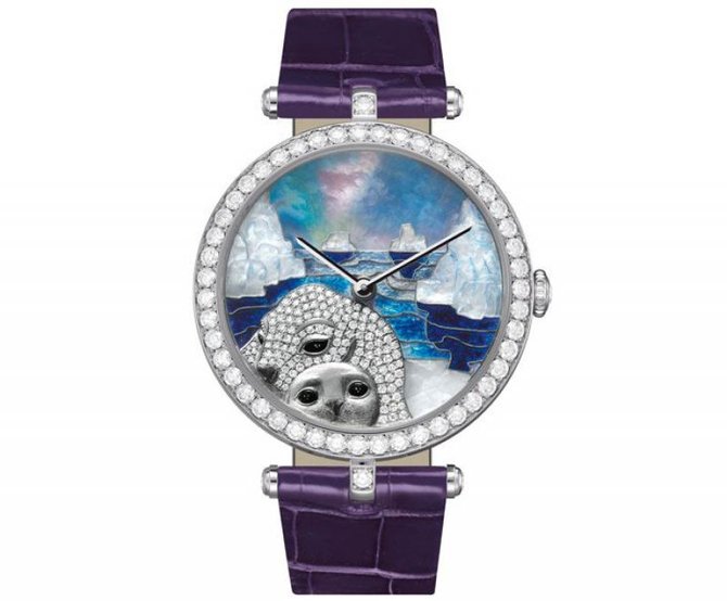 Данная коллекция представлена в круглом корпусе из белого золота, размером 38 мм, оснащена механикой с автоподзаводом, поставляется на фиолетовом ремешке из кожи аллигатора, неповторимости добавляет яркий декор.Чтобы максимально реалистично изобразить на циферблате тюленей, перед нанесением эмалевого покрытия на золотой основе была выполнена гравировка, позволяющая создать иллюзию движения.