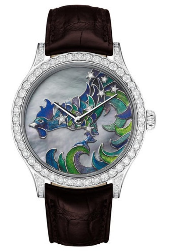 Ювелирная модель женских часов от компании Van Cleef & Arpels. Корпус швейцарских часов изготовлен из белого золота. Диаметр корпуса - 42 миллиметра. Безель и "ушки" инкрустированы белыми бриллиантами классической огранки. Рифленая заводная головка. Ремешок пошит из кожи аллигатора. Застежка раскладного типа выполнена из белого золота. Внутри корпуса стоит механический механизм с автоматическим подзаводом собственного производства мануфактуры Van Cleef & Arpels. Он гарантирует индикацию на художественном циферблате основных функций наручных часов - часов и минут. Данная модель выпущена в 2014 году. Герметичные возможности корпуса - 30 метров.