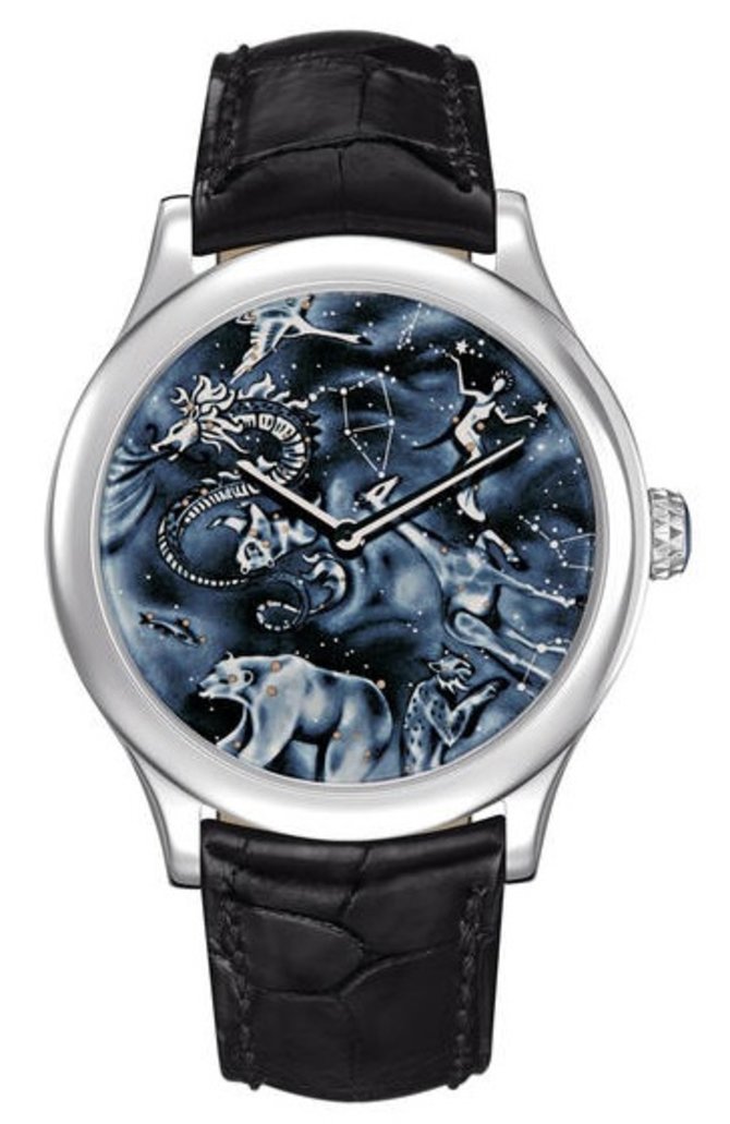 В довольно крупном, как для классической модели, корпусе из белого золота расположен механический швейцарский механизм с автоматическим подзаводом, разработанный и собранный мануфактурой Van Cleef & Arpels. Диаметр корпуса - 45 мм. На экстраординарном циферблате указываются часы и минуты. Заводная головка рифленая. Модель стала достойным дополнением коллекции "Poetic Complication". Черный ремешок из натуральной кожи луизианского аллигатора с помощью раскладывающейся застежки из белого золота поможет закрепить швейцарские часы на руке. Год выпуска модели - 2014.