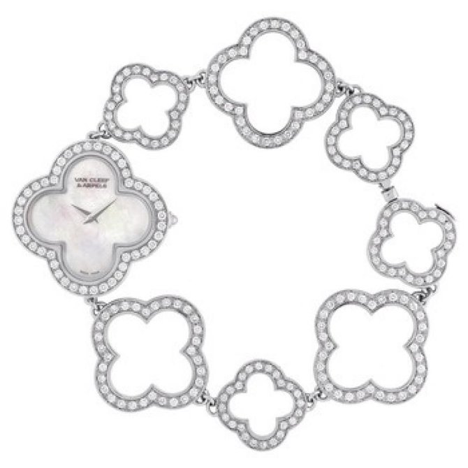 Часы из коллекции Alhambra обладают вневременной элегантостью. Они изготовлены в знаковых мотивах модного дома. Часы сверкают своими гранями на запястье. На белом жемчужном циферблате расположены центральные часовая и минутная стрелки. Часы поставляются на браслете из белого золота 18к, инкрустированном белыми бриллиантами. Корпус диаметром 29.3 мм изготовлен из белого золота 18к и обладает водонерпоницаемостью до 30 метров. Безель инкрустирован белыми бриллиантами. Внутри корпуса заключен швейцарский кварцевый механизм.