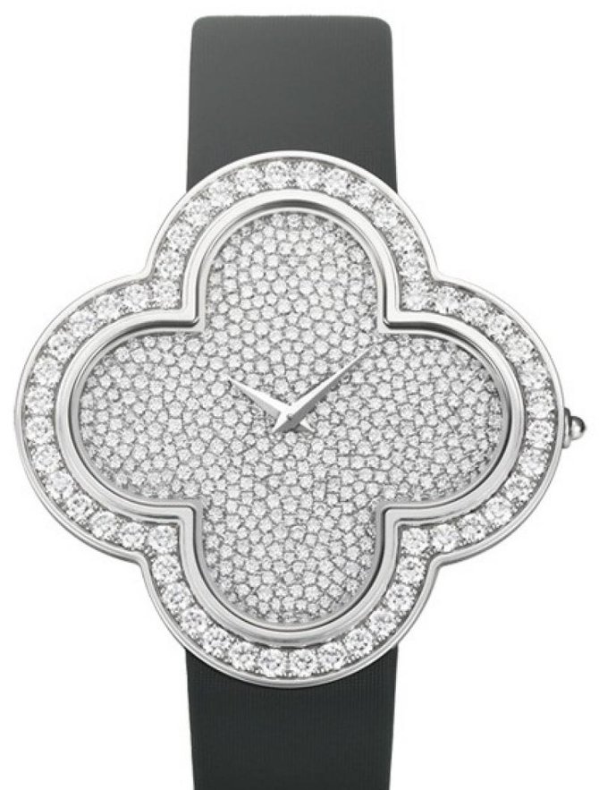 Часы из коллекции Alhambra обладают вневременной элегантостью. Они изготовлены в знаковых мотивах модного дома. Сверкая своими гранями на запястье, часы являют миру шедевр ювелирного искусства. Бриллиантовое паве покрывает циферблат. 496 сверкающих бриллиантов, подобно снегу, усыпали лицевую поверхность часов. Часы поставляются на черном атласном ремешке с застежкой из белого золота 18к, инкрустированной 60-ю белыми бриллиантами. Корпус диаметром 40 мм изготовлен из белого золота 18к и обладает водонерпоницаемостью до 30 метров. Внутри корпуса заключен швейцарский кварцевый механизм.