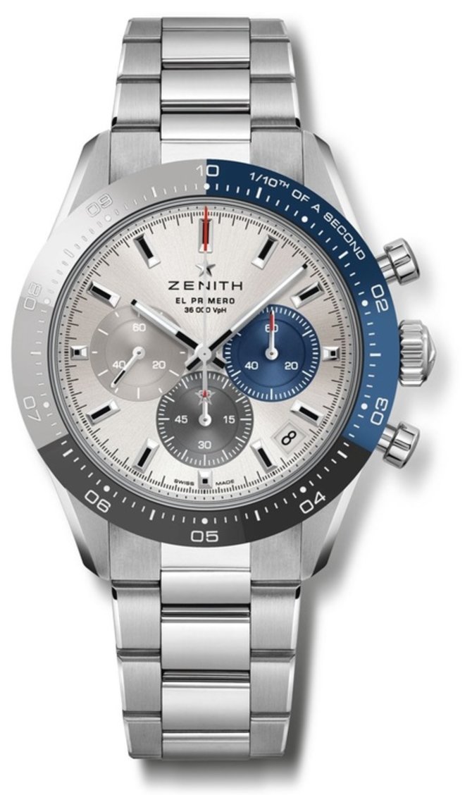 В круглом корпусе из нержавеющей стали, что укомплектован стальным браслетом с раскладной застежкой, компания Zenith презентовала модель швейцарских наручных часов Chronomaster Sport 03.3103.3600/69.M3100 на базе автоматического калибра El Primero 3600 с запасом хода на 60 часов работы. На циферблате, защищенном стеклом из сапфирового кристалла с противобликовым эффектом, показываются часы, минуты, секунды, дата, тахиметр и показания хронографа. Часовая разметка и стрелки для индикации времени покрыты люминесцентным составом, что светится в темноте. Безель с тахиметрической шкалой произведен из керамики. Водонепроницаемость корпуса рассчитана на 100 метров. Год выпуска часов - 2022.
