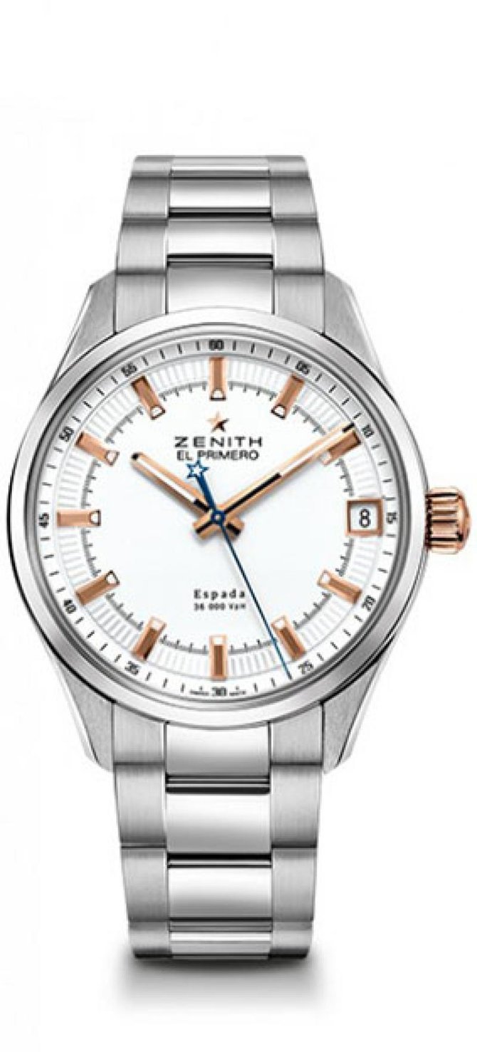 После Первой мировой войны компания сумела довести выпуск своих наручных часов до двух миллионов штук в год. В годы Второй мировой войны Zenith (Зенит) выпускала часовые механизмы для устройств военного назначения. Открываются новые филиалы в Женеве, Лондоне, Париже, Нью-Йорке, Вене и в Москве. В 1969 году компания выпускает модель El Primero - автоматический хронограф, который и сегодня остается самым точным хронографом в мире. В 1999 году компанию Zenith приобретает группа LVMH. У компании Zenith более 1500 наград, более 50 легендарных калибров. Это не удивительно, ведь мануфактура знаменита уникальными механизмами. Наручные часы Zenith (Зенит) сегодня оснащаются механическим ультратонким калибром Elite и 22-линейным механизмом 5011. Zenith представляет на международной выставке Baselworld-2012 свою новую модель - трехстрелочник Espada. Новинка имеет круглый корпус из нержавеющей стали, диаметром 40 мм. Сапфировое стекло защищает белый циферблат с накладными часовыми индексами, часовой и минутной стрелками, с золотым покрытием. На противовесе центральной секундной стрелки имеется фигурная звездочка - эмблема бренда. Модель оснащена мануфактурным автоматическим механизмом El Primero без модуля хронографа, с балансовой частотой 36000 полуколебаний в час (5 гц), 50-часовым запасом хода, функциями индикации часов, минут, секунд (посредством соответствующих центральных стрелок) и даты (в апертуре на 3 часах). Задняя крышка с гравировкой и медальоном из 18-каратного золота (вес золота: 5,0 г). Браслет из стали. Тройная раскладывающаяся застежка.