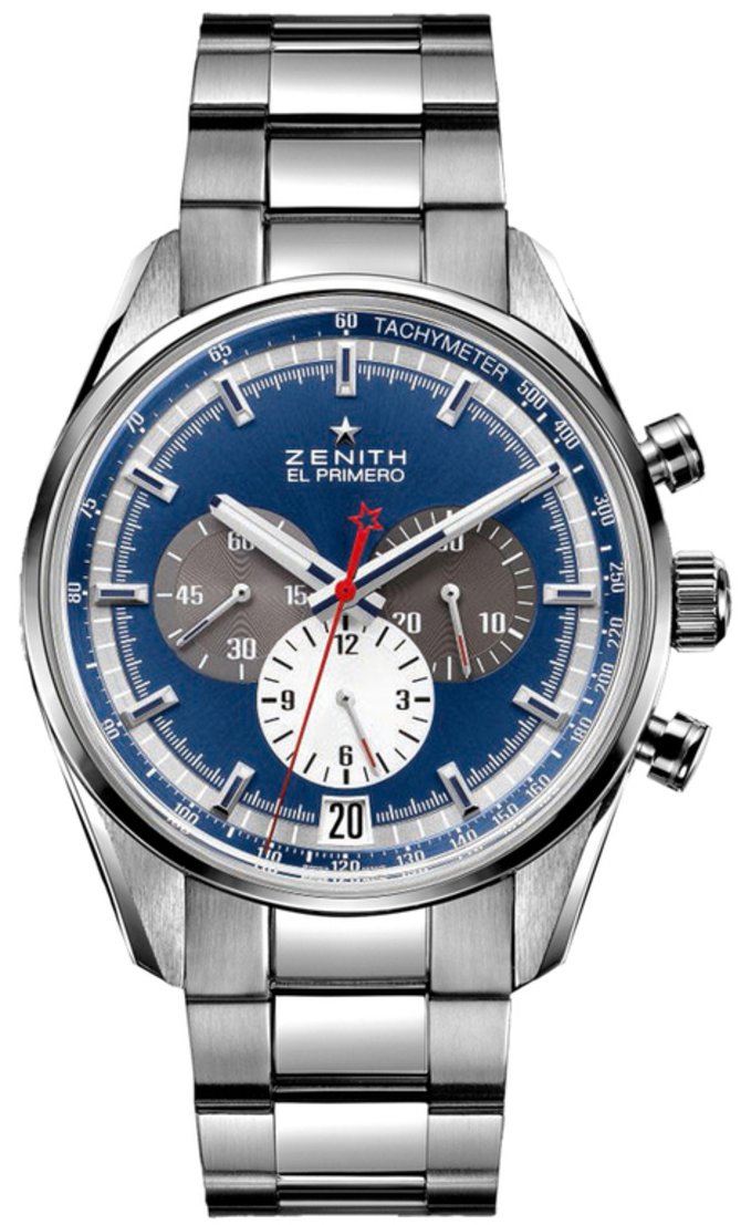 Наручные часы от легендарного швейцарского производителя Zenith выполнены в корпусе из нержавеющей стали высшего качества, диаметром 42 мм и толщиной 12.75 мм. В таких габаритах успешно размещено сердце часов - механический мануфактурный калибр 400 В с автоподзаводом, хронографом и официальным сертификатом хронометра от швейцарского института хронометрии COSC. Механизм имеет оптимальный запас хода - 50 часов. Это значит, что часы минимум 50 часов могут функционировать без подзавода, а так, как здесь подзавод автоматический, то модель просто нужно надевать на руку с интервалом в 50 часов. На синем циферблате под сапфировым стеклом с антибликовым покрытием указываются часы, минуты, секунды, дата, данные хронографа, а также нанесена тахиметрическая шкала на фланце. Водонепроницаемость этих швейцарских часов Zenith - 100 метров, что равносильно 10 барам.