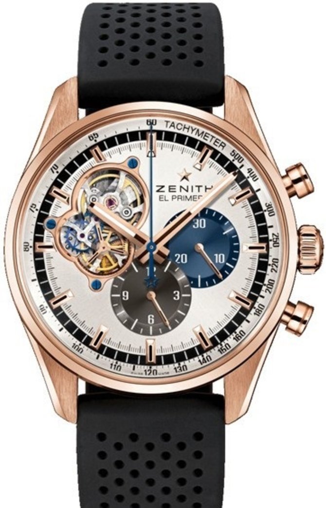 Элегантные спортивные швейцарские часы Zenith Chronomaster El Primero Open - 42.00 18.2040.4061/69.R576 выпущены маркой в корпусе из полированного розового золота, размером 42 x 14.05 мм. Браслет выполнен из каучука и дополнен золотой вставкой - классической пряжкой. Серебристый циферблат с золотыми вставками, которые покрыты люминесцентным составом, обеспечивает индикацию данных текущего времени даже в условиях плохого освещения. Корпус обладает герметичностью в 100 метров. Механизм имеет функцию хронографа для измерения промежутков времени. Стекло, которое защищает циферблат, выполнено из сапфира. Запас хода механизма рассчитан на 50 часов.