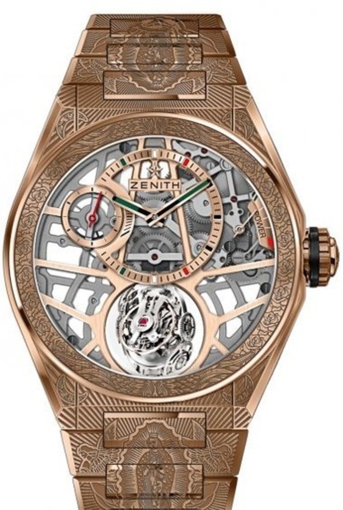 Уникальные наручные часы Zenith Defy Zero G выпущены легендарной маркой Zenith в корпусе из розового золота, диаметром 44 мм, с нанесением вручную эксклюзивной гравировки, в том числе и на браслет из розового золота. Застежка к браслету раскладного типа. Водонепроницаемость корпуса рассчитана на погружение под воду до 100-метровой глубины. Внутри корпуса установлен механизм с ручным заводом производства Zenith - El Primero 8812 S, имеющий запас хода на 50 часов работы без подзавода. На скелетированном циферблате с золотыми вставками показываются часы, минуты, секунды и уровень запаса хода механизма. На уровне отметки "6 часов" расположен гравитационный модуль. Часы укомплектованы браслетом из розового золота. Эксклюзивная модель выпущена в единственном экземпляре.