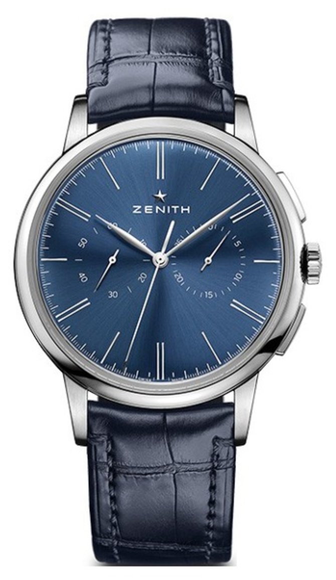 Модель классических наручных часов с хронографом от компании Zenith имеет корпус круглой формы из матовой нержавеющей стали. Корпус, диаметром 42 миллиметра, содержит внутри себя автоматический калибр El Primero 4069 с колонным колесом, обеспечивающий индикацию текущего времени и данных хронографа. Механизм состоит из 254 деталей, где 35 из них - драгоценные камни. Балансовая частота - 36 000 пк/ч (5 Гц). Минимальный запас хода механизма - 50 часов. Стекло сапфировое, немного выпуклое, с двусторонним антибликовым покрытием. Задняя крышка тоже из сапфирового стекла. Герметичность корпуса - 50 метров. Стрелки и цифры с родиевым напылением. Ремешок из кожи крокодила с подкладкой из каучука дополняет тройная раскладывающаяся застежка из стали.