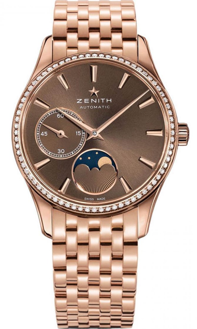 Элегантная женская модель наручных часов от компании Zenith, выполнена из розового золота 18К. Безель инкрустирован белыми бриллиантами. Циферблат - коричневого цвета. В часах установлен автоматический механизм, Калибр Elite 692, с запасом хода 50 часов.