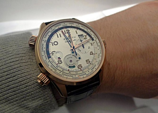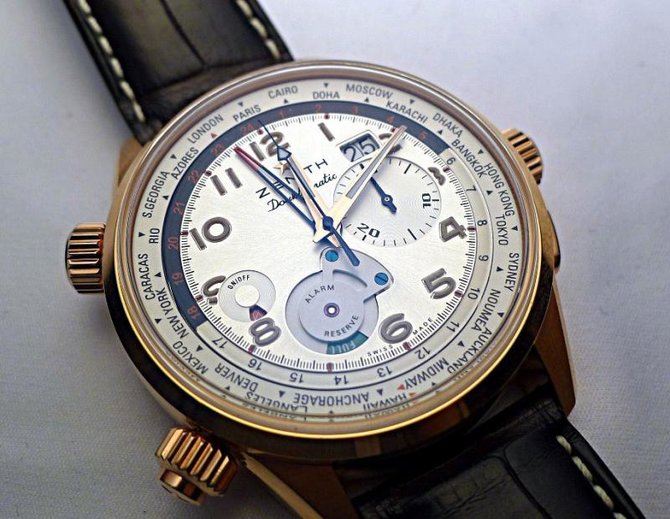 Zenith Pilot Doublematic - позиционируемые как часы для авиаторов, новые Pilot Doublematic конечно подойдут и для тех, кто летает в самолетах только в качестве пассажира или вообще ездит на поезде, но, главное, любит престижные часы. "Вчера Каир. Сегодня Токио. Завтра Москва, и пусть смена часовых поясов Вас не пугает. В часах Pilot Doublematic с функцией «всемирного времени» Вы всегда будете идти в ногу со временем" - обещает компания ZENITH. Кроме того в новых часах есть будильник, хронограф на 30 минут и "большая дата" в двойной апертуре.
