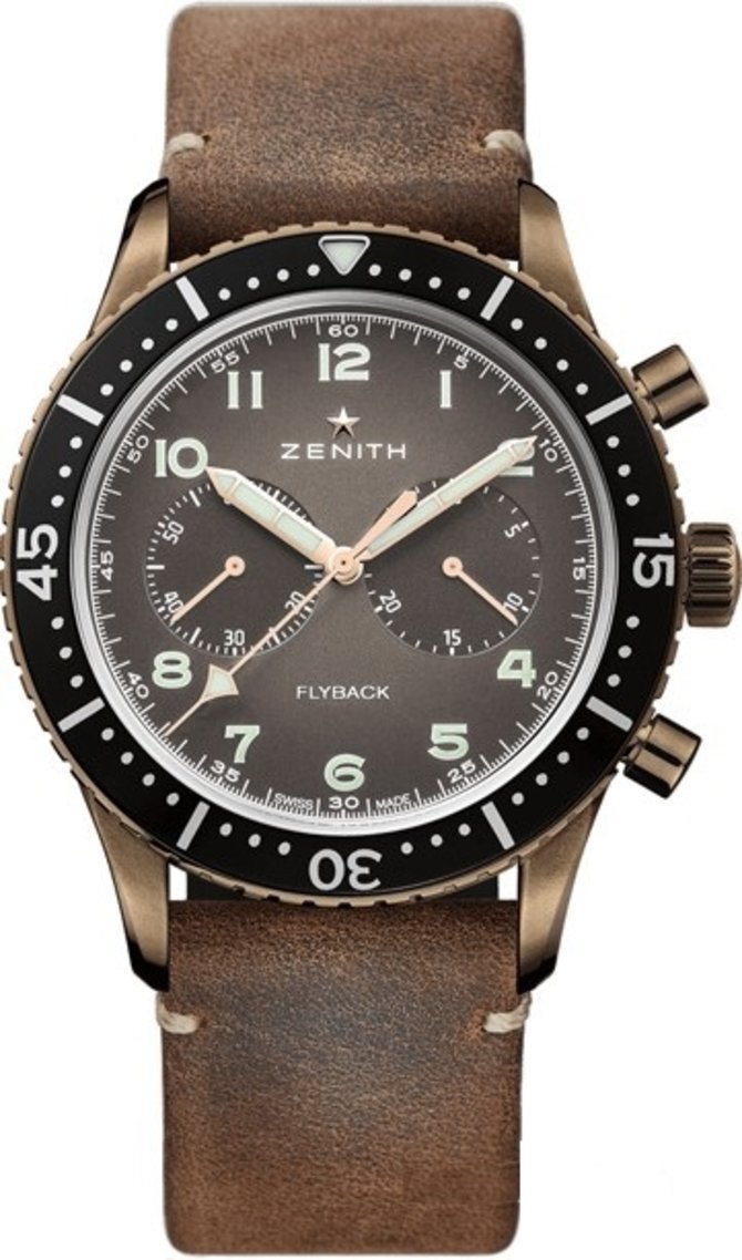 Водостойкий автоматический хронограф от швейцарской компании Zenith. Модель Pilot Cronometro Tipo CP2 - 43.00 29.2240.405/18.C801 выпущена в круглом бронзовом корпусе с керамическим безелем, диаметром 43 мм. Мануфактурный калибр El Primero 405B с 50 часами запаса хода и функцией хронографа. Герметичность модели - 100 метров. Толщина корпуса - 13 мм. Ремешок пошит из натуральной кожи теленка коричневого цвета. Выпуклое стекло выполнено из сапфирового кристалла. Часовые метки и стрелки с нанесением люминесцентного покрытия. Застежка, которой дополнен ремешок, изготовлена из титана. Кроме данных хронографа, также на циферблате указываются часы, минуты и секунды.